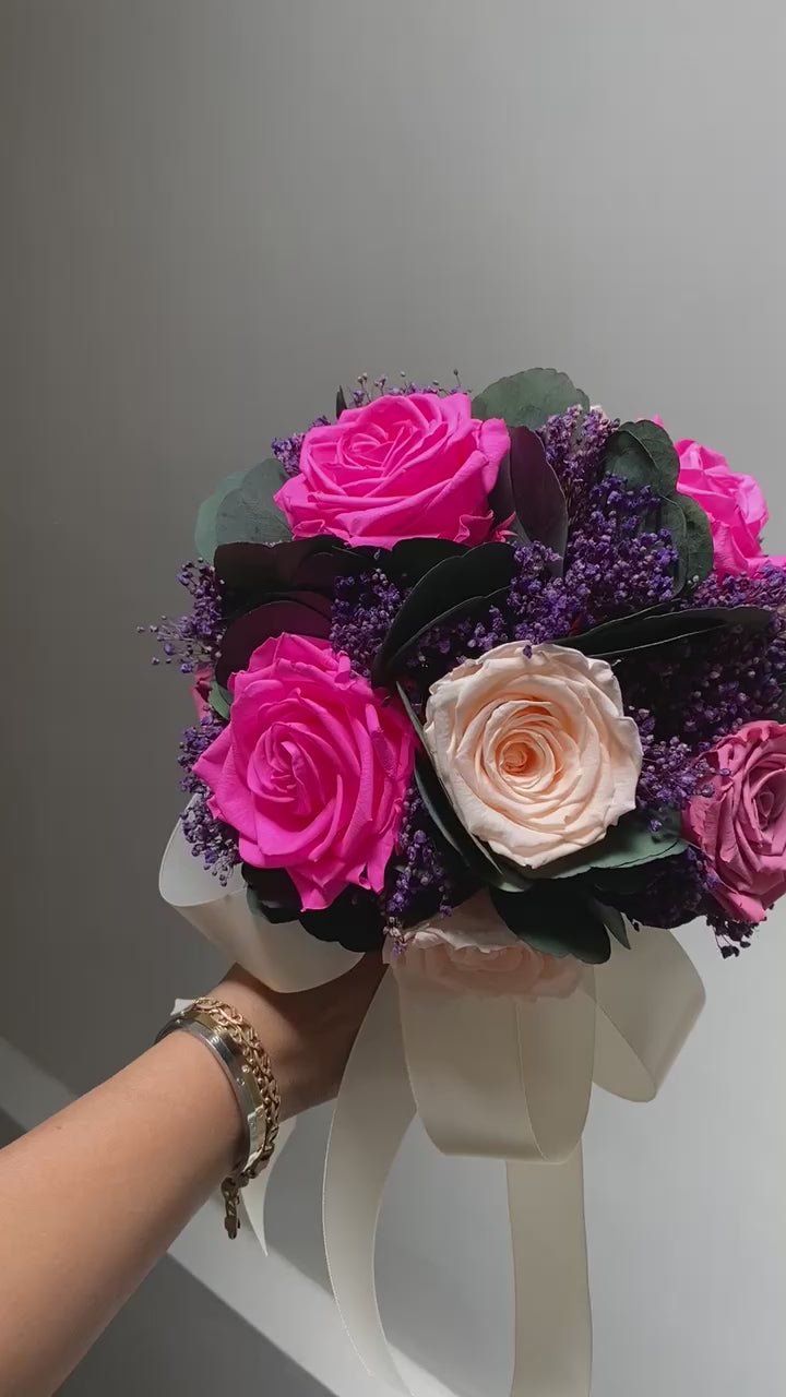 Hermoso ramo de rosas naturales preservadas y follaje, en tonos rosas y morado. El follaje se puede modificar a cualquier otro color, para adaptarnos a tu paleta de Boda.